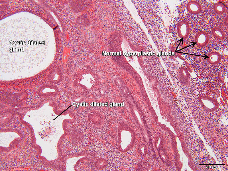 - Endometruin with simple hyperplasia without atypia and with metaplasia (the metaplasia is not diplayed in the image to the left, so if you didn't think of that it doesn't matter).