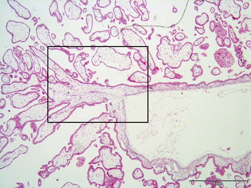 The chorionic plate lining the cavity is better seen, and you can see that the villi are arising from this plate.
