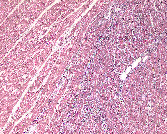 Definer et infarkt og beskriv de mikroskopiske funnene til et iskemisk hjerteinfarkt som skjer over tid..