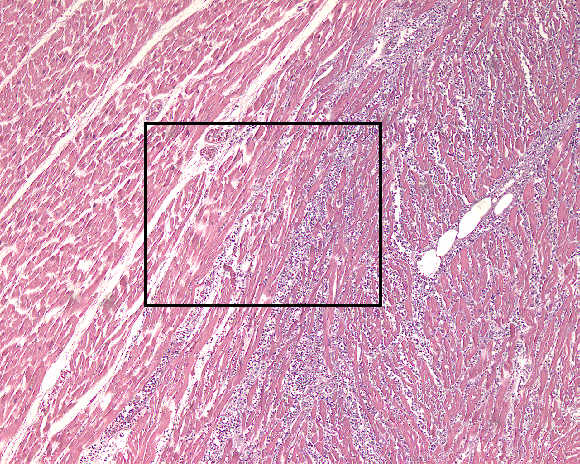 Definer et infarkt og beskriv de mikroskopiske funnene til et iskemisk hjerteinfarkt som skjer over tid..