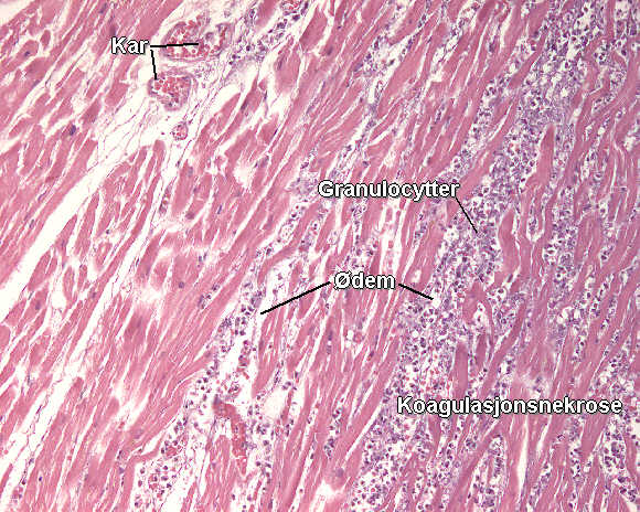 Bildet viser koagulasjonsnekrose med tap av tverrstripning og cellekjerner. Granulocyttinfiltrasjon. Ødem. |
