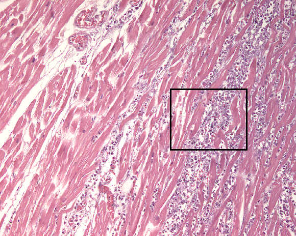 Bildet viser koagulasjonsnekrose med tap av tverrstripning og cellekjerner. Granulocyttinfiltrasjon. Ødem. |